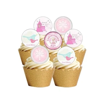 24 pre cut Christening Baby Girl Edible wafer paper Cake Toppers You will receive 24 Christening themed toppers. Each topper is 4cm diameter These toppers are pre cut out for you in 4cm circles and are ready to place straight on your cakes Printed on quality wafer Paper with edible inks-perfect for a baby girls christening Printed onto Wafer Paper - Ingredients, Water, Sunflower Oil and Potato Starch