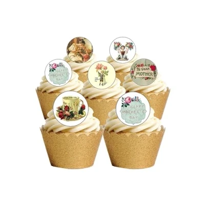 24 Precut Round Edible Vintage Victorian Style Mothers Day Cupcake toppers You will receive toppers exactly as shown in the photo - pre cut and ready to place straight on your cakes Great Vintage style Mothers Day themed edible cake toppers- perfect to say thank you to mum Precut out for you in 40mm circles and ready to place straight on your cakes Fully edible, printed with edible inks. Wafer Paper Ingredients - Water, Sunflower Oil and Potato Starch