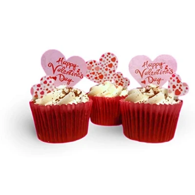 24 Red Muffin cases & 24 Precut Mixed Design/Size Valentines Day Heart Shaped Edible Wafer Paper Cupcake Toppers Cake topper Images are as shown in the Picture - You will receive 24 precut hearts in the mix exactly as shown in the picture(6 large with Happy Valentines Day, 6 large with heart pattern and 12 small with heart pattern) The cake toppers are precut out for you and ready to place straight on your cakes - Just push them gently into stiff buttercream 24 Red Muffin Cake cases for baking - Size 55 x 33cm Fully Edible cake toppers - Wafer Paper ingredients - Water, Sunflower Oil and potato starch