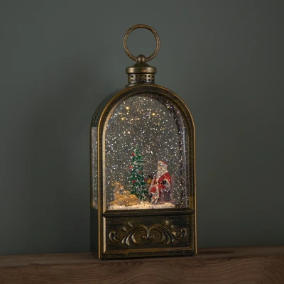 Bring the magic of Christmas to life with this 24cm Light up Christmas Water Spinner with Santa Scene. A decoration designed to capture the warmth and wonder of Christmas, this elegant spinner combines movement, light, and classic festive imagery to create a captivating centerpiece.. Featuring a delightful scene of Santa beside a Christmas tree. This enchanting decoration is filled with swirling silver glitter, gently illuminated by a soft warm white LED light, casting a beautiful glow that brings the festive scene to life. The spinner is dual powered, giving you the flexibility to run it using 3 x AA batteries (not included) for cordless display, or with a mains transformer (not included) for continuous use throughout the season.. Suitable for indoor use only.. Product Specifications. Warm White LED. Height: 24cm Length: 13cm Width: 9cm. Dual Powered, Requires 3 x AA Batteries or a Transformer
