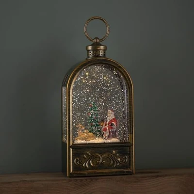 AmazonCharming Festive Scene: Features Santa beside a decorated Christmas tree for a classic holiday touch. Swirling Silver Glitter Effect: Water spinner filled with glitter that gently swirls, creating a magical, snow globe-style display. Warm White LED Lighting: Soft illumination enhances the festive atmosphere, perfect for cosy winter nights. Dual Power Options: Operates on 3 x AA batteries (not included) or with an optional mains transformer (not included). Perfect for Any Room: Adds sparkle and charm to mantels, shelves, windowsills, or holiday centerpieces.