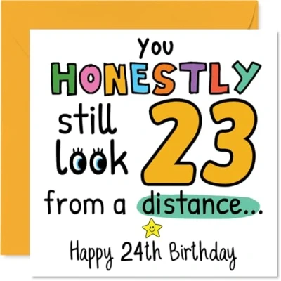 MAKE THEM SMILE WITH THIS UNIQUE BIRTHDAY CARD: This exceptional quality birthday card for him or her shows the design 'You Honestly still look 23 from a distance Happy 24th Birthday'. If you are looking for special birthday greetings cards for Men birthday card then then this happy birthday card is bound to make them smile. Not just for birthday gifts for Men this could also be for Granddaughter, Colleague, Brother, Nephew, Son, Niece, Sister or Daughter. WHAT DO YOU GET: The card is printed on one side and BLANK ON THE INSIDE to allow you to write your very own message. The unique fun design is printed on a specially sourced and environmentally responsible board. At 360 microns thick the natural white one-sided gloss board has a quality look and feel. Supplied with a coloured gummed envelope to complement the design and ready to be sealed and sent in the post. Great Granddaughter birthday cards, Colleague birthday card. NO INK SMUDGES: There is nothing worse than writing inside a card to find that the shiny surface makes the ink smudge. This is why we use a high quality one sided coated board. The uncoated side will absorb more of the ink from your pen to make smudging a thing of the past. 24th Birthday card for Brother, 24th Birthday card for Nephew, 24th Birthday card for Son. SIZES: Greeting Card = 145mm x 145mm, Envelope = 155mm x 155mm, Card Thickness = 360 micron. Niece 24th birthday card, birthday cards for Sister, special birthday cards for Daughter, 24th birthday card Granddaughter, Colleague 24th birthday card. MADE AND QUALITY CHECKED IN THE UK: We print and manufacture all our products right here in the UK so you can be sure of a fast turnaround and a product that is expertly made. Using environmentally responsible premium board our card is conscious of the responsible management of the world's forests - perfect birthday cards for Men, fun birthday cards for him, Colleague 24th birthday cards, female birthday cards.