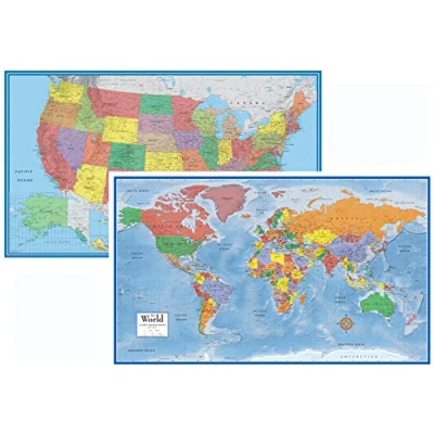 Large 24x36 poster World and USA Maps - LAMINATED for Dry-Erase 2 Map Set - each wall map printed on 100lb paper 3D visual terrain relief of the World & United States Perfect World and USA map for business, home or educational use Completely up-to-date USA and World Wall Map Laminated Poster