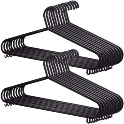 Durable Construction: Made from heavy-duty plastic, these hangers are designed for long-lasting use. Size : 37.5cm Space-Saving Design: With a trouser bar and clips, these hangers allow you to neatly hang multiple garments. QUALITY MATTERS ALOTTTTT Versatile Use: Suitable for hanging suits, dresses, shirts, trousers, and more in your wardrobe or on a clothes rail. Easy Organisation: The black colour of these hangers helps keep your clothes organised and your closet looking tidy. Bulk Pack: This 25-pack of hangers provides ample storage for your entire wardrobe.