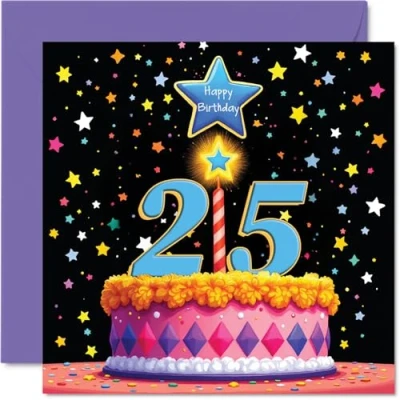 25th Birthday Cards for Women Men Pink Cake & Stars Happy Card 25 Year Old Woman Man Uncle Daughter Nephew Cousin, 145mm Bday Greeting