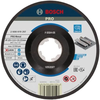Designed for cutting metal Highly efficient for metalworkers: Long Life With 22.23 mm bore for standard locking nut angle grinders For cutting metal in general metalworking applications Scope of delivery: Bosch PRO Metal X-Lock Cutting Disc, 125 x 2.5 x 22.23 mm, Weight: 0.1322773572 Pounds, Manufacturer: Bosch