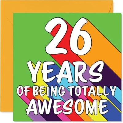 MAKE THEM SMILE WITH THIS UNIQUE BIRTHDAY CARD: This exceptional quality birthday card for him or her shows the design '26 YEARS OF BEING TOTALLY AWESOME'. If you are looking for special birthday greetings cards for Men birthday card then then this happy birthday card is bound to make them smile. Not just for birthday gifts for Men this could also be for Son, Auntie, Niece, Uncle, Daughter, Sister, Friend or Colleague. WHAT DO YOU GET: The card is printed on one side and BLANK ON THE INSIDE to allow you to write your very own message. The unique fun design is printed on a specially sourced and environmentally responsible board. At 360 microns thick the natural white one-sided gloss board has a quality look and feel. Supplied with a coloured gummed envelope to complement the design and ready to be sealed and sent in the post. Great Son birthday cards, Auntie birthday card. DESIGNED FOR WRITING: There is nothing worse than writing inside a card to find that the shiny surface makes the ink smudge. This is why we use a high quality one sided coated board. The uncoated side will absorb more of the ink from your pen to make smudging a thing of the past. 26th Birthday card for Niece, 26th Birthday card for Uncle, 26th Birthday card for Daughter. SIZES: Greeting Card = 145mm x 145mm, Envelope = 155mm x 155mm, Card Thickness = 360 micron. Sister 26th birthday card, birthday cards for Friend, special birthday cards for Colleague, 26th birthday card Son, Auntie 26th birthday card. MADE AND QUALITY CHECKED IN THE UK: We print and manufacture all our products right here in the UK so you can be sure of a fast turnaround and a product that is expertly made. Using environmentally responsible premium board our card is conscious of the responsible management of the world's forests - perfect birthday cards for Men, fun birthday cards for him, Auntie 26th birthday cards, female birthday cards.