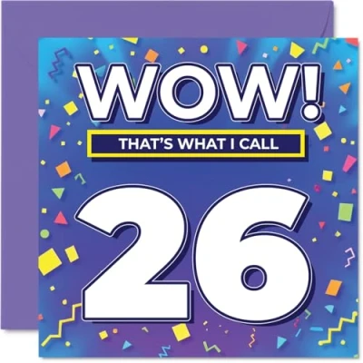 MAKE THEM SMILE WITH THIS UNIQUE BIRTHDAY CARD: This exceptional quality birthday card for him or her shows the design 'Wow! That?s What I Call 26'. If you are looking for special birthday greetings cards for Men birthday card then then this happy birthday card is bound to make them smile. Not just for birthday gifts for Men this could also be for Son, Auntie, Niece, Uncle, Daughter, Sister, Friend or Colleague. WHAT DO YOU GET: The card is printed on one side and BLANK ON THE INSIDE to allow you to write your very own message. The unique fun design is printed on a specially sourced and environmentally responsible board. At 360 microns thick the natural white one-sided gloss board has a quality look and feel. Supplied with a coloured gummed envelope to complement the design and ready to be sealed and sent in the post. Great Son birthday cards, Auntie birthday card. DESIGNED FOR WRITING: There is nothing worse than writing inside a card to find that the shiny surface makes the ink smudge. This is why we use a high quality one sided coated board. The uncoated side will absorb more of the ink from your pen to make smudging a thing of the past. 26th Birthday card for Niece, 26th Birthday card for Uncle, 26th Birthday card for Daughter. SIZES: Greeting Card = 145mm x 145mm, Envelope = 155mm x 155mm, Card Thickness = 360 micron. Sister 26th birthday card, birthday cards for Friend, special birthday cards for Colleague, 26th birthday card Son, Auntie 26th birthday card. MADE AND QUALITY CHECKED IN THE UK: We print and manufacture all our products right here in the UK so you can be sure of a fast turnaround and a product that is expertly made. Using environmentally responsible premium board our card is conscious of the responsible management of the world's forests - perfect birthday cards for Men, fun birthday cards for him, Auntie 26th birthday cards, female birthday cards.