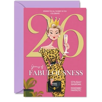 MAKE HER SMILE WITH THIS UNIQUE BIRTHDAY CARD: This exceptional quality birthday card for her shows the design 'Wishing you all the best as you celebrate 26 years of fabulousness'. If you are looking for special birthday greetings cards for Women birthday card then then this happy birthday card is bound to make her smile. Not just for birthday gifts for Women this could also be for Auntie, Cousin, Daughter, Niece, Sister, Friend, Colleague or Neighbour. WHAT DO YOU GET: The cards are printed on both sides with the inside print saying 'Have a Luminously Lovely Day' and ample space for your own personal message. The unique design is printed on a specially sourced and environmentally responsible board. At 360 microns thick the natural white one-sided gloss board has a quality look and feel. Supplied with a coloured gummed envelope to complement the design and ready to be sealed and sent in the post. NO INK SMUDGES: There is nothing worse than writing inside a card to find that the shiny surface makes the ink smudge. This is why we use a high quality one sided coated board. The uncoated side will absorb more of the ink from your pen to make smudging a thing of the past. 26th Birthday card for Daughter, 26th Birthday card for Niece, 26th Birthday card for Sister. SIZES: Greeting Card = 148mm x 210mm, Envelope = 150mm x 212mm, Card Thickness = 360 micron. Friend 26th birthday card, birthday cards for Colleague, cute birthday cards for Neighbour, 26th birthday card Auntie, Cousin 26th birthday card. MADE AND QUALITY CHECKED IN THE UK: We print and manufacture all our products right here in the UK so you can be sure of a fast turnaround and a product that is expertly made. Using environmentally responsible premium board our card is conscious of the responsible management of the world's forests - perfect birthday cards for Women, fun birthday cards for her, Cousin 26th birthday cards, female birthday cards.