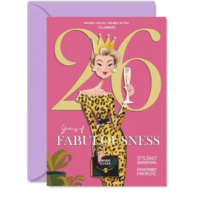 MAKE HER SMILE WITH THIS UNIQUE BIRTHDAY CARD: This exceptional quality birthday card for her shows the design 'Wishing you all the best as you celebrate 26 years of fabulousness'. If you are looking for special birthday greetings cards for Women birthday card then then this happy birthday card is bound to make her smile. Not just for birthday gifts for Women this could also be for Friend, Cousin, Niece, Daughter, Wife, Neighbour, Sister or Colleague. WHAT DO YOU GET: The cards are printed on both sides with the inside print saying 'Have a Luminously Lovely Day' and ample space for your own personal message. The unique design is printed on a specially sourced and environmentally responsible board. At 360 microns thick the natural white one-sided gloss board has a quality look and feel. Supplied with a coloured gummed envelope to complement the design and ready to be sealed and sent in the post. NO INK SMUDGES: There is nothing worse than writing inside a card to find that the shiny surface makes the ink smudge. This is why we use a high quality one sided coated board. The uncoated side will absorb more of the ink from your pen to make smudging a thing of the past. 26th Birthday card for Niece, 26th Birthday card for Daughter, 26th Birthday card for Wife. SIZES: Greeting Card = 127mm x 178mm, Envelope = 130mm x 180mm, Card Thickness = 360 micron. Neighbour 26th birthday card, birthday cards for Sister, cute birthday cards for Colleague, 26th birthday card Friend, Cousin 26th birthday card. MADE AND QUALITY CHECKED IN THE UK: We print and manufacture all our products right here in the UK so you can be sure of a fast turnaround and a product that is expertly made. Using environmentally responsible premium board our card is conscious of the responsible management of the world's forests - perfect birthday cards for Women, fun birthday cards for her, Cousin 26th birthday cards, female birthday cards.