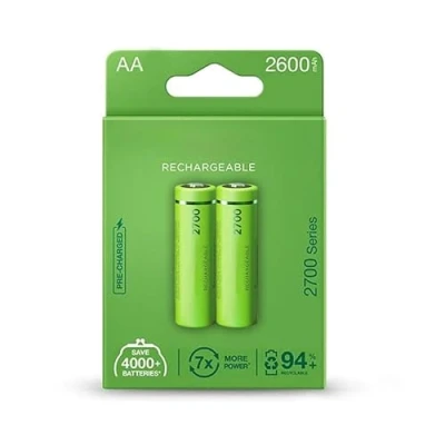 2700mAh AA Rechargeable Battery Factory Precharged Ideal for Everyday Use of Electronic Devices - Blister Pack of 2 Charge retention: up to 80% after 12 months, life cycle: up to 500 times. 10% recycled materials (validated with Environmental Claim Validation Certificate (ECV)), NiMH refillable with eco-friendly properties, putting less stress on the environment