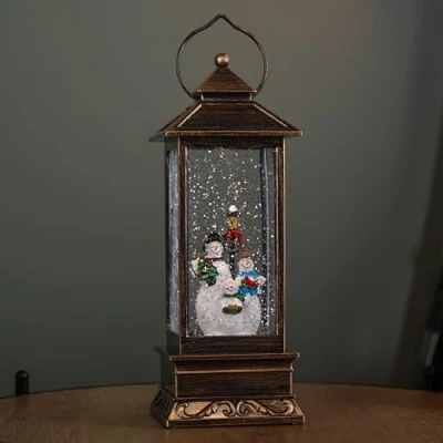 Add a charming, nostalgic touch to your Christmas decor with this 27cm Light up Christmas Lantern Water Spinner with Snowman Scene. A decoration designed to capture the magic of Christmas, whether placed on a mantelpiece, windowsill, shelf, or tabletop, this compact decoration is a charming addition to any Christmas display.. In the style of a bronze effect lantern, featuring a delightful Snowman scene inside, the water spinner is Illuminated by a warm white LED that softly glows highlighting the joyful snowmen and creating a cosy, festive ambience. The integrated water spinner mechanism keeps the glitter in motion, ensuring constant sparkle without the need for shaking. Powered by 3 x AA batteries (not included), it offers fuss free placement anywhere in your home. The black on/off switch, discreetly located on the underside, allows for easy operation while maintaining the decorations classic appearance. For added convenience, it features a built in 6 hour on / 18 hour off timer, allowing the decoration to automatically light up at the same time each day without manual switching.. Suitable for indoor use only.. Product Specifications. Warm White LED. Height: 27cm Length: 9cm Width: 9cm. Requires 3 x AA Batteries. Timer Function 6 hours on 18 hours off