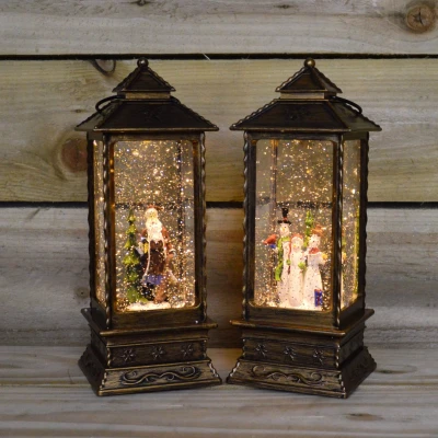 Bring a touch of nostalgic festive charm to your home with this 27cm Light Up Lantern Christmas Water Spinner with Snowman Scene. Designed with a beautiful antique effect finish, this decorative piece captures the warmth and magic of a traditional Christmas.. Inside the lantern, a delightful festive scene comes to life, featuring a family of snowmen surrounded by gently swirling snow glitter. The lantern illuminates with warm white LEDs, casting a soft, cosy glow that enhances the festive scene and makes it perfect for displaying on most suitable flat surfaces.. For ease and convenience, the water spinner is battery operated and requires 4 x AAA batteries (not included), allowing you to place it anywhere without the need for cables. Alternatively, the water spinner can be used with a transformer plug without the need to replace the batteries.. Suitable for indoor use only.. Product Specifications. Warm White LEDs. Height: 27cm Width: 10cm. Requires 4 x AAA Batteries or Transformer Plug