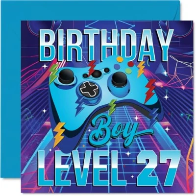 27th Birthday Cards for Men Gamer Level Happy Card 27 Year Old Man Uncle Son Husband Nephew, 145mm Bday Greeting