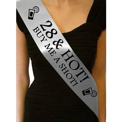 '28 & Hot - Buy me a shot' Party Sash - Silver Our bold, eye catching Birthday sash will really make you stand out from the crowd. Hopefully you'll get a free shot from wearing this sash too! Memorable Keepsake - Our personalised sash isn't just for the moment, it’s also a keepsake to cherish your event and memories for years to come Cut from high quality satin ribbon, each sash comes complete with a secure safety pin ensuring a comfortable fit for each wearer. The sash measurements are 160cm x 10cm (62" x 4"), ideal for most adults., Weight: 0.0440924524 pounds, Manufacturer: Fancy Pants Store Ltd