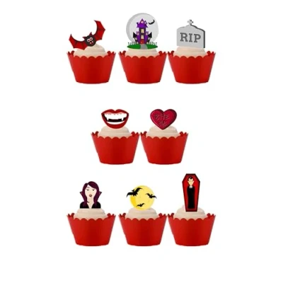 28 Stand Up Halloween VAMPIRE Clipart Style Edible Wafer Paper Cake Toppers Decorations Images are as shown in the Picture - Printed onto edible wafer paper with edible inks These toppers require cutting out with sharp scissors and are then ready to place straight on your cakes 28 Stand Up Halloween Vampire clipart style images to create great cake toppers - printed with edible inks onto fully edible wafer paper Fully Edible - Wafer Paper ingredients - Water, sunflower Oil and potato starch, Manufacturer: Top That