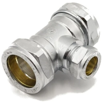 This chrome plated reducing tee with compression ends is ideal for hot and cold water services, including heating installations in homes. It is available in various sizes. A Compression Reducing Tee is a plumbing fitting designed to connect three pipes of varying sizes in a "T" configuration. It uses compression fittings on each end, enabling easy installation without the need for soldering or welding. The "reducing" feature indicates that the tee joins pipes of different diameters. This fitting is valued for its convenience, versatility, and secure connections between differently sized pipes.. JTM Chrome Compression Reducing Tee - 28mm x 28mm x 15mm (Branch) Brass Chrome Plated