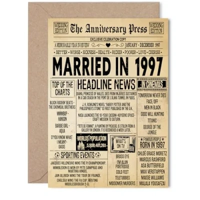 MAKE THEM SMILE WITH THIS UNIQUE ANNIVERSARY CARD: This exceptional quality anniversary card for her or him shows the design 'The Anniversary Press Married In 1997'. If you are looking for special anniversary greetings cards for Women wedding anniversary card then then this happy anniversary card is bound to make them smile. Not just for anniversary gifts for Men this could also be for Husband, Companion, Wife or Partner. WHAT DO YOU GET: The cards are printed on both sides with the inside print saying 'Read All About It! Have A Headline Grabbing Newsworthy Anniversary' and ample space for your own personal message. The unique design is printed on a specially sourced and environmentally responsible board. At 360 microns thick the natural white one-sided gloss board has a quality look and feel. Supplied with a coloured gummed envelope to complement the design and ready to be sealed and sent in the post. NO INK SMUDGES: There is nothing worse than writing inside a card to find that the shiny surface makes the ink smudge. This is why we use a high quality one sided coated board. The uncoated side will absorb more of the ink from your pen to make smudging a thing of the past. 29th anniversary card for Wife, 29th anniversary card for Partner, 29th anniversary card for Husband. SIZES: Greeting Card = 127mm x 178mm, Envelope = 130mm x 180mm, Card Thickness = 360 micron. Husband 29th anniversary card, anniversary cards for Companion, cute anniversary cards for Wife, 29th anniversary card Partner, Husband 29th anniversary card. MADE AND QUALITY CHECKED IN THE UK: We print and manufacture all our products right here in the UK so you can be sure of a fast turnaround and a product that is expertly made. Using environmentally responsible premium board our card is conscious of the responsible management of the world's forests - perfect anniversary cards for Men, cute anniversary cards for her, Companion 29th anniversary cards, female anniversary cards.