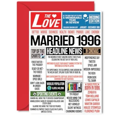MAKE THEM SMILE WITH THIS UNIQUE ANNIVERSARY CARD: This exceptional quality anniversary card for her or him shows the design 'Married 1996'. If you are looking for thoughtful anniversary greetings cards for men, dad anniversary cards or 30th anniversary card for women then then this happy anniversary card is bound to make them laugh. Not just for friendship gifts for women this could also be for Mum, Grandma, Nan, Nanny, Dad, Grandad, Gramps, Work Colleague, Brother, Sister, Auntie or Uncle. WHAT DO YOU GET: The card is printed on one side and BLANK ON THE INSIDE to allow you to write your very own message. The unique fun design is printed on a specially sourced and environmentally responsible board. At 360 microns thick the natural white one-sided gloss board has a quality look and feel. Supplied with a coloured gummed envelope to complement the design and ready to be sealed and sent in the post. Great Aunt anniversary cards, 30th anniversary card, adult anniversary card. NO INK SMUDGES: There is nothing worse than writing inside a card to find that the shiny surface makes the ink smudge. This is why we use a high quality one sided coated board. The uncoated side will absorb more of the ink from your pen to make smudging a thing of the past. 30th anniversary card for Daughter, back in 1996 card, female anniversary cards. SIZES: Greeting Card = 127mm x 178mm, Envelope = 130mm x 180mm, Card Thickness = 360 micron. Brother or Sister anniversary cards from Step Brother or Sister in Law. Cousin 30th anniversary card, anniversary cards for brother, rude anniversary cards for men, 30th anniversary card sister, Friend 30th anniversary card. MADE AND QUALITY CHECKED IN THE UK: We print and manufacture all our product right her in the UK so you can be sure of a fast turnaround and a product that is expertly made. Using environmentally responsible premium board our card is conscious of the responsible management of the world's forests - rude anniversary cards for women, funny anniversary cards for her, Work Colleague 30th anniversary cards, funny male anniversary cards.