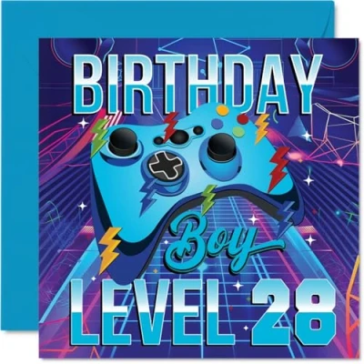 28th Birthday Cards for Men Gamer Level Happy Card 28 Year Old Man Son Cousin Uncle Husband, 145mm Bday Greeting