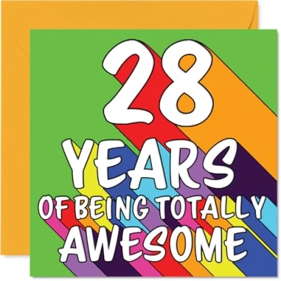 MAKE THEM SMILE WITH THIS UNIQUE BIRTHDAY CARD: This exceptional quality birthday card for him or her shows the design '28 YEARS OF BEING TOTALLY AWESOME'. If you are looking for special birthday greetings cards for Men birthday card then then this happy birthday card is bound to make them smile. Not just for birthday gifts for Men this could also be for Niece, Uncle, Daughter, Sister, Friend, Colleague, Wife or Brother. WHAT DO YOU GET: The card is printed on one side and BLANK ON THE INSIDE to allow you to write your very own message. The unique fun design is printed on a specially sourced and environmentally responsible board. At 360 microns thick the natural white one-sided gloss board has a quality look and feel. Supplied with a coloured gummed envelope to complement the design and ready to be sealed and sent in the post. Great Niece birthday cards, Uncle birthday card. DESIGNED FOR WRITING: There is nothing worse than writing inside a card to find that the shiny surface makes the ink smudge. This is why we use a high quality one sided coated board. The uncoated side will absorb more of the ink from your pen to make smudging a thing of the past. 28th Birthday card for Daughter, 28th Birthday card for Sister, 28th Birthday card for Friend. SIZES: Greeting Card = 145mm x 145mm, Envelope = 155mm x 155mm, Card Thickness = 360 micron. Colleague 28th birthday card, birthday cards for Wife, special birthday cards for Brother, 28th birthday card Niece, Uncle 28th birthday card. MADE AND QUALITY CHECKED IN THE UK: We print and manufacture all our products right here in the UK so you can be sure of a fast turnaround and a product that is expertly made. Using environmentally responsible premium board our card is conscious of the responsible management of the world's forests - perfect birthday cards for Men, fun birthday cards for him, Uncle 28th birthday cards, female birthday cards.