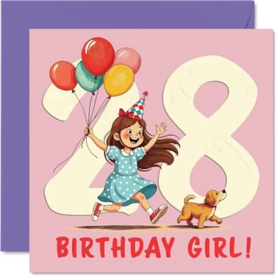 28th Birthday Cards for Women Balloon Girl Happy Card 28 Year Old Woman Cousin Colleague Neighbour Auntie, 145mm Bday Greeting