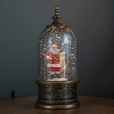 AmazonCharming Festive Scene: Features a delightful Santa and reindeer inside a glass-look cloche, perfect for traditional holiday décor. Mesmerising Glitter Spinner: Silver glitter swirls continuously around the scene, creating a magical snowfall effect. Warm White LED Illumination: Soft lighting enhances the sparkle and brings a cosy festive glow to any room. Elegant Bronze-Effect Finish: A vintage-style bronze look adds sophistication and warmth to your Christmas display. Battery Operated Convenience: Powered by 3 x AA batteries (not included), with no wires or plugs required.