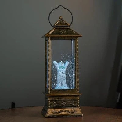 AmazonInspired by The Snowman: Features the iconic Snowman character from the beloved Christmas classic, capturing the magic of the story in a beautiful winter scene. Magical Swirling Glitter Effect: A gentle water spinner keeps silver glitter in motion, creating a calming snow like effect that brings the scene to life and adds festive sparkle to any room. RGB LED Lighting: Built-in RGB LEDs cycle through vibrant colours, casting a soft, colourful glow over the scene and creating a warm, cheerful holiday atmosphere. Elegant Bronze Effect Finish: Styled with a traditional bronze effect frame, this lantern adds a touch of timeless charm and fits seamlessly with classic or modern Christmas decor. Dual Power Options: Operates using either 3 x AA batteries or a transformer (both not included), giving you the freedom to display it anywhere indoors without worrying about cables.