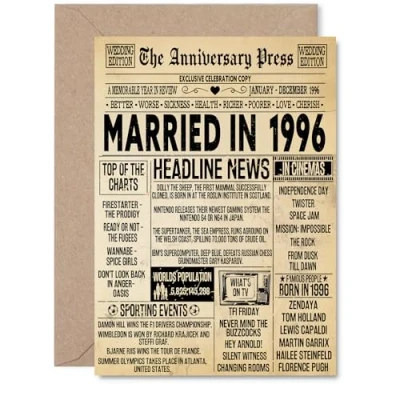29th Anniversary Card for Men Women Vintage Newspaper Married in 1996 Happy 29 Year Wedding Husband Partner Wife Companion, A5 Anniversaries Greeting Cards