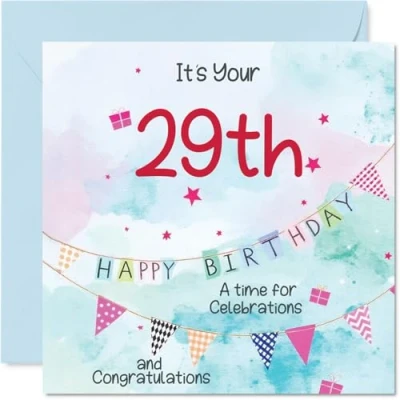 MAKE HIM SMILE WITH THIS UNIQUE BIRTHDAY CARD: This exceptional quality birthday card for him shows the design 'Its your 29th Happy Birthday A time for celebrations and congratulations'. If you are looking for special birthday greetings cards for Men birthday card then then this happy birthday card is bound to make him smile. Not just for birthday gifts for Men this could also be for Uncle, Son, Cousin, Brother, Friend, Neighbour, Colleague or Nephew. WHAT DO YOU GET: The card is printed on one side and BLANK ON THE INSIDE to allow you to write your very own message. The unique fun design is printed on a specially sourced and environmentally responsible board. At 360 microns thick the natural white one-sided gloss board has a quality look and feel. Supplied with a coloured gummed envelope to complement the design and ready to be sealed and sent in the post. Great Uncle birthday cards, 29th birthday card, Son birthday card. DESIGNED FOR WRITING: There is nothing worse than writing inside a card to find that the shiny surface makes the ink smudge. This is why we use a high quality one sided coated board. The uncoated side will absorb more of the ink from your pen to make smudging a thing of the past. 29th Birthday card for Cousin, 29th Birthday card for Brother, 29th Birthday card for Friend. SIZES: Greeting Card = 145mm x 145mm, Envelope = 155mm x 155mm, Card Thickness = 360 micron. Neighbour 29th birthday card, birthday cards for Colleague, cute birthday cards for Nephew, 29th birthday card Uncle, Son 29th birthday card. MADE AND QUALITY CHECKED IN THE UK: We print and manufacture all our products right here in the UK so you can be sure of a fast turnaround and a product that is expertly made. Using environmentally responsible premium board our card is conscious of the responsible management of the world's forests - perfect birthday cards for Men, fun birthday cards for him, Son 29th birthday cards, female birthday cards.