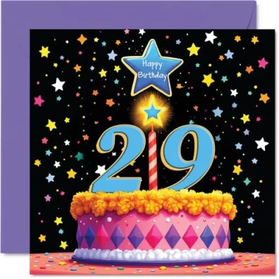 29th Birthday Cards for Women Men Pink Cake & Stars Happy Card 29 Year Old Woman Man Sister Wife Colleague Neighbour, 145mm Bday Greeting