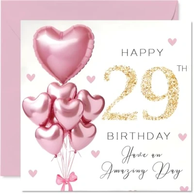 29th Birthday Cards for Women Pink Glitter Balloons Happy Card 29 Year Old Woman Sister Auntie Friend Colleague, 145mm Bday Greeting