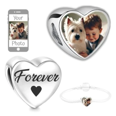 IMPORTANT: Use the tool to compose your custom Charm Heart. Please make sure the picture covers the entire printing area by using the zoom feature! The charm will be printed exactly as shown in the preview you create. We recommend using a photo of only one person or pet for the best effect. This Photo Bead is personalized with your own picture, making it truly unique. No group photos, no text, no collages. We do not provide engraving. Dimensions: Fits Most European-Style Bracelets and Necklaces. Suitable for both necklaces and bracelets. (Small piece; please keep it away from children.) Material: Metal steel, Heart shape size: Approximately 9x11mm Includes: Comes with an organza pouch. Note: Bracelet not included. Heart charm only. Details: One photo is printed on the front of the heart. The back of the heart is silver. Reminder: Please keep in mind a ±5% gap between the charm's edge and the picture.