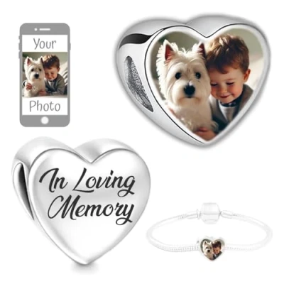 IMPORTANT: Use the tool to compose your custom Charm Heart. Please make sure the picture covers the entire printing area by using the zoom feature! The charm will be printed exactly as shown in the preview you create. We recommend using a photo of only one person or pet for the best effect. This Photo Bead is personalized with your own picture, making it truly unique. No group photos, no text, no collages. We do not provide engraving. Dimensions: Fits Most European-Style Bracelets and Necklaces. Suitable for both necklaces and bracelets. (Small piece; please keep it away from children.) Material: Metal steel, Heart shape size: Approximately 9x11mm Includes: Comes with an organza pouch. Note: Bracelet not included. Heart charm only. Details: One photo is printed on the front of the heart. The back of the heart is silver. Reminder: Please keep in mind a ±5% gap between the charm's edge and the picture.