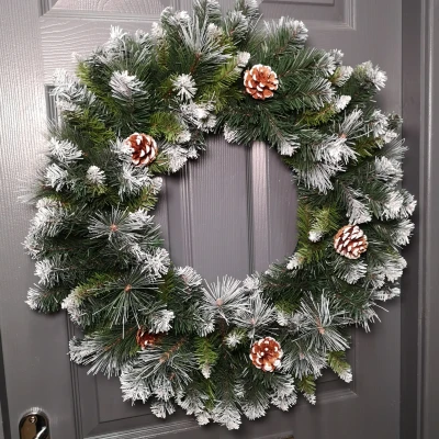 Add some greenery to the home this Christmas with this 60cm Frosted Glacier wreath. 40cm sturdy green metal double ring frame, wrapped with green branches with painted white tips for a frosted effect. Includes decorative pine cones that have been lightly painted for a wintery feel. Quick and easy to setup, simply arrange the branches to preference which should give an approximate diameter of 60cm. Contains 200 tips for a full and bushy look. Matching items also available; search for "Frosted Glacier"