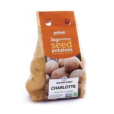 CHARLOTTE SECOND EARLY SEED POTATOES (2kg): Charlotte potatoes are the most popular potato in the UK and known for their versatility as a boiling, mashing and salad potato. Winner of the RHS Award of Garden Merit. Harvest Second Early varieties 13 – 15 weeks after planting for best results, with the traditional planting time being March – April. Very good resistance to foliage and tuber blight. Very good resistance to foliage and tuber blight. PERFECT FOR BOILING, MASHING & SALADS: Potatoes are a wonderful staple in our diets, but the variety really does make all the difference. Charlotte potatoes are long with a yellow skin and firm yellow waxy flesh that make it a superb salad potato. Charlotte potatoes taste amazing when they have been boiled, sliced or sautéed. Enjoy with salads or on the side of fish or make into some creamy mashed potato. EASY TO PLANT: When planting in the ground, set your tubers 10 inches apart so they have space to grow; for planting in limited outdoor space at home, put 3 tubers in a 45-litre planting bag. Second Early varieties benefit from a nitrogenous fertiliser when you dig them up for the second time. Choose a place in the garden which has not been used to grow garlic, onions, shallots or leeks for at least two years. The soil should be well drained and not have been manured for at least one year. SEED POTATOES FROM THE SEED POTATO EXPERTS: Before planting your seed potatoes, we recommend “chitting” – allowing the potatoes to sprout – 6 weeks beforehand. Once your tubers have started to sprout, they are ready to be planted ahead of a delicious harvest. Keep your seed potatoes out of extreme weather conditions and temperature changes prior to planting to ensure strong potatoes. Dunk each tuber in water prior to planting. FROM THE GROUND UPWARDS – SEED POTATOES GROWN IN SCOTLAND SINCE 1895: Jamieson Brothers were established in 1895 where we began selling our potatoes in 50kg bags on a horse and cart. Our seed potatoes are UK grown and still hand sorted in Scotland. From seed to plate, Jamieson Brothers sees the seed potatoes through the entire harvest. We ship to your doorstep so you can enjoy growing seed potatoes in your home, allotment, or farm.