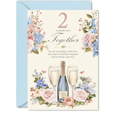 2nd Anniversary Card for Men Women Floral Champagne Happy 2 Year Husband Partner Wife Girlfriend, 5x7 Inch Wedding Anniversaries Greeting Cards