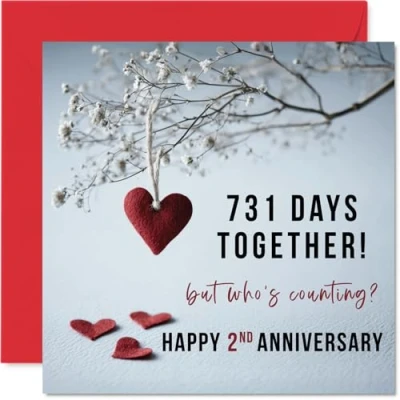 MAKE THEM SMILE WITH THIS ROMANTIC ANNIVERSARY CARD: This exceptional quality anniversary card for her or him shows the design '731 Days Together! But whos counting? Happy 2nd Anniversary'. If you are looking for special anniversary greetings cards for Women anniversary card then then this happy anniversary card is bound to make them smile. Not just for anniversary gifts for Men this could also be for Girlfriend, Partner, Wife, Husband, Companion or Boyfriend. WHAT DO YOU GET: The card is printed on one side and BLANK ON THE INSIDE to allow you to write your very own message. The romantic and cute design is printed on a specially sourced and environmentally responsible board. At 360 microns thick the natural white one-sided gloss board has a quality look and feel. Supplied with a coloured gummed envelope to complement the design and ready to be sealed and sent in the post. 2nd anniversary cards, Partner anniversary card. NO INK SMUDGES: There is nothing worse than writing inside a card to find that the shiny surface makes the ink smudge. This is why we use a high quality one sided coated board. The uncoated side will absorb more of the ink from your pen to make smudging a thing of the past. 2nd anniversary card for Wife, 2nd anniversary card for Husband, 2nd anniversary card for Companion. SIZES: Greeting Card = 145mm x 145mm, Envelope = 155mm x 155mm, Card Thickness = 360 micron. Companion 2nd anniversary card, anniversary cards for Wife, cute anniversary cards for Husband, 2nd anniversary card Girlfriend, Partner 2nd anniversary card. MADE AND QUALITY CHECKED IN THE UK: We print and manufacture all our products right here in the UK so you can be sure of a fast turnaround and a product that is expertly made. Using environmentally responsible premium board our card is conscious of the responsible management of the world's forests - perfect anniversary cards for Men, cute anniversary cards for her, Partner 2nd anniversary cards, female anniversary cards.