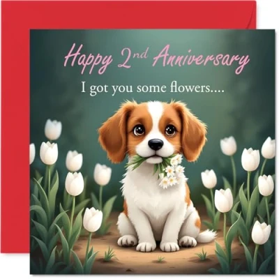 MAKE THEM SMILE WITH THIS ROMANTIC ANNIVERSARY CARD: This exceptional quality anniversary card for her or him shows the design 'Happy 2nd Anniversary I got you some flowers?.'. If you are looking for special anniversary greetings cards for Women anniversary card then then this happy anniversary card is bound to make them smile. Not just for anniversary gifts for Men this could also be for Girlfriend, Partner, Wife, Husband, Companion or Boyfriend. WHAT DO YOU GET: The card is printed on one side and BLANK ON THE INSIDE to allow you to write your very own message. The romantic and cute design is printed on a specially sourced and environmentally responsible board. At 360 microns thick the natural white one-sided gloss board has a quality look and feel. Supplied with a coloured gummed envelope to complement the design and ready to be sealed and sent in the post. 2nd anniversary cards, Partner anniversary card. NO INK SMUDGES: There is nothing worse than writing inside a card to find that the shiny surface makes the ink smudge. This is why we use a high quality one sided coated board. The uncoated side will absorb more of the ink from your pen to make smudging a thing of the past. 2nd anniversary card for Wife, 2nd anniversary card for Husband, 2nd anniversary card for Companion. SIZES: Greeting Card = 145mm x 145mm, Envelope = 155mm x 155mm, Card Thickness = 360 micron. Companion 2nd anniversary card, anniversary cards for Wife, cute anniversary cards for Husband, 2nd anniversary card Girlfriend, Partner 2nd anniversary card. MADE AND QUALITY CHECKED IN THE UK: We print and manufacture all our products right here in the UK so you can be sure of a fast turnaround and a product that is expertly made. Using environmentally responsible premium board our card is conscious of the responsible management of the world's forests - perfect anniversary cards for Men, cute anniversary cards for her, Partner 2nd anniversary cards, female anniversary cards.