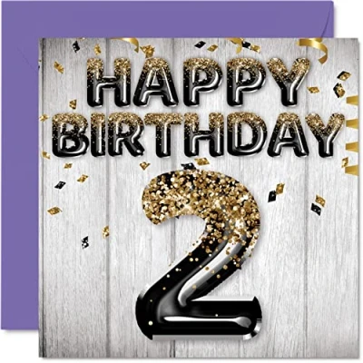 MAKE THEM SMILE WITH THIS AWESOME BIRTHDAY CARD: This exceptional quality birthday card for Him shows the design of black & gold glitter balloons stating 'Happy Birthday 2'. If you are looking for funny birthday cards for Men, then then this happy birthday card is bound to make them laugh. Not just for friendship gifts for Men this could also be for Best Friend, Work Colleague, Dad, Grandpa, Nan, Dad, Grandad, Grandad, Colleague, Brother, Brother, Cousin, Uncle or Uncle. WHAT DO YOU GET: The card is printed on one side and BLANK ON THE INSIDE to allow you to write your very own message. The unique fun design is printed on a specially sourced and environmentally responsible board. At 360 microns thick the natural white one-sided gloss board has a quality look and feel. Supplied with a coloured gummed envelope to complement the design and ready to be sealed and sent in the post. Birthday card for Grandson, 2nd birthday card for Him. NO INK SMUDGES: There is nothing worse than writing inside a card to find that the shiny surface makes the ink smudge. This is why we use a high quality one sided coated board. The uncoated side will absorb more of the ink from your pen to make smudging a thing of the past. Grandson birthday cards, Toddler birthday card, birthday card cute, 2nd birthday gifts for Boys, 2nd birthday gifts for Grandson, Little Brother birthday cards. SIZES: Greeting Card = 145mm x 145mm, Envelope = 155mm x 155mm, Card Thickness = 360 micron. Great Son birthday cards from Dad and Dad, male birthday card, 2nd birthday card, happy birthday Grandson cards, Niece 2nd birthday cards, Cousin birthday card. MADE AND QUALITY CHECKED IN THE UK: We print and manufacture all our product right Him in the UK so you can be sure of a fast turnaround and a product that is expertly made. Using environmentally responsible premium board our card is conscious of the responsible management of the world's forests - Little Brother 2nd birthday cards, Goddaughter 2nd birthday cards, happy male birthday cards.