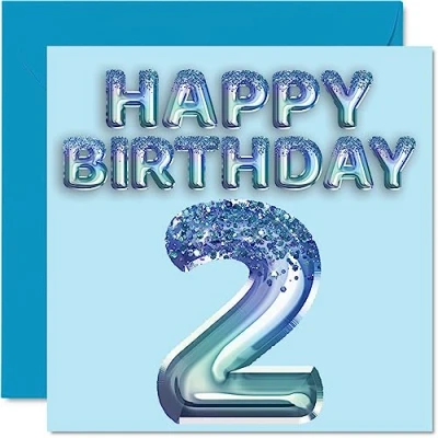 MAKE THEM SMILE WITH THIS AWESOME BIRTHDAY CARD: This exceptional quality birthday card for Him shows the design of blue glitter party balloons stating 'Happy Birthday 2'. If you are looking for funny birthday cards for Men, then then this happy birthday card is bound to make them laugh. Not just for friendship gifts for Men this could also be for Best Friend, Work Colleague, Dad, Grandpa, Nan, Dad, Grandad, Grandad, Colleague, Brother, Brother, Cousin, Uncle or Uncle. WHAT DO YOU GET: The card is printed on one side and BLANK ON THE INSIDE to allow you to write your very own message. The unique fun design is printed on a specially sourced and environmentally responsible board. At 360 microns thick the natural white one-sided gloss board has a quality look and feel. Supplied with a coloured gummed envelope to complement the design and ready to be sealed and sent in the post. Birthday card for Nephew, 2nd birthday card for Him. NO INK SMUDGES: There is nothing worse than writing inside a card to find that the shiny surface makes the ink smudge. This is why we use a high quality one sided coated board. The uncoated side will absorb more of the ink from your pen to make smudging a thing of the past. Nephew birthday cards, Toddler birthday card, birthday card cute, 2nd birthday gifts for Boys, 2nd birthday gifts for Nephew, Little Brother birthday cards. SIZES: Greeting Card = 145mm x 145mm, Envelope = 155mm x 155mm, Card Thickness = 360 micron. Great Son birthday cards from Mum and Dad, male birthday card, 2nd birthday card, happy birthday Grandson cards, Nephew 2nd birthday cards, Cousin birthday card. MADE AND QUALITY CHECKED IN THE UK: We print and manufacture all our product right Him in the UK so you can be sure of a fast turnaround and a product that is expertly made. Using environmentally responsible premium board our card is conscious of the responsible management of the world's forests - Little Brother 2nd birthday cards, Godson 2nd birthday cards, happy male birthday cards.