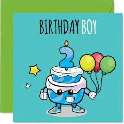 MAKE HIM SMILE WITH THIS UNIQUE BIRTHDAY CARD: This exceptional quality birthday card for him shows the design 'Birthday Boy 2'. If you are looking for special birthday greetings cards for Boys birthday card then then this happy birthday card is bound to make him smile. Not just for birthday gifts for Boys this could also be for Nephew, Grandson, Brother, Godson, Great Nephew, Step Son, Cousin or Son. WHAT DO YOU GET: The card is printed on one side and BLANK ON THE INSIDE to allow you to write your very own message. The unique fun design is printed on a specially sourced and environmentally responsible board. At 360 microns thick the natural white one-sided gloss board has a quality look and feel. Supplied with a coloured gummed envelope to complement the design and ready to be sealed and sent in the post. Great Nephew birthday cards, 2nd birthday card, Grandson birthday card. NO INK SMUDGES: There is nothing worse than writing inside a card to find that the shiny surface makes the ink smudge. This is why we use a high quality one sided coated board. The uncoated side will absorb more of the ink from your pen to make smudging a thing of the past. 2nd Birthday card for Brother, 2nd Birthday card for Godson, 2nd Birthday card for Great Nephew. SIZES: Greeting Card = 145mm x 145mm, Envelope = 155mm x 155mm, Card Thickness = 360 micron. Step Son 2nd birthday card, birthday cards for Cousin, cute birthday cards for Son, 2nd birthday card Nephew, Grandson 2nd birthday card. MADE AND QUALITY CHECKED IN THE UK: We print and manufacture all our products right here in the UK so you can be sure of a fast turnaround and a product that is expertly made. Using environmentally responsible premium board our card is conscious of the responsible management of the world's forests - perfect birthday cards for Boys, fun birthday cards for him, Grandson 2nd birthday cards, female birthday cards.