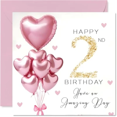 2nd Birthday Cards for Girls Pink Glitter Balloons Happy Card 2 Year Old Girl Sister Step Daughter Cousin, 145mm Bday Greeting