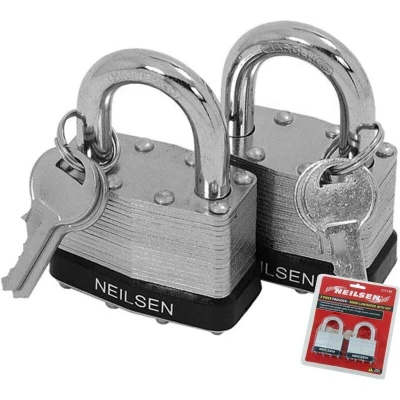 General description Neilsen 2pc Laminated Alike Security Padlock features a steel shackle and comes with 4 keys, providing enhanced security for your belongings. Technical specifications Type: Laminated padlock Shackle material: Steel Size: 50mm Quantity: 2 padlocks Keys: 4 keys (2 per padlock) Other information Reinforced, laminated steel body for strength and durability.