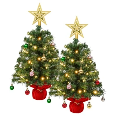 2PCS mini Christmas Tree, 2ft Tabletop Tree with Lights, Topper Star and Xmas Baubles, for Home Kitchen Dining Table Decor