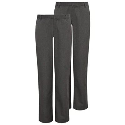 Amazon Ages 3, 4, 5, 6, 7, 8, 9, 11, 12, 13, 14, 15, 16, 17 and 18 Years These Twinpack trousers are treated with a Teflon fabric protector, which offers excellent protection against both water and oil-based spills. All school wear is machine washable. The waistband has a flat-back construction. 65% Polyester, 35% Viscose. Regular Fit Adjustable waistband Hook and eye fastening