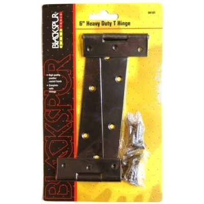 6 or 12 Heavy Duty T Hinges - (Pairs) (Sizes Sold Separately) Blackspur BB-BH181 PAIR 6 HEAVY DUTY T HINGE (WITH FITTING) Blackspur heavy duty T hinge Includes pack of 2 High quality powder coated finish Complete with fittings Colour: Black Blackspur BB-BH184 Pair of 12 Heavy Duty T-Hinges - Black (WITH FITTING) Manufactured with a black high-quality powder coated finish Come complete with fittings Size: 12-inch Strong and durable Supplied in double blister header