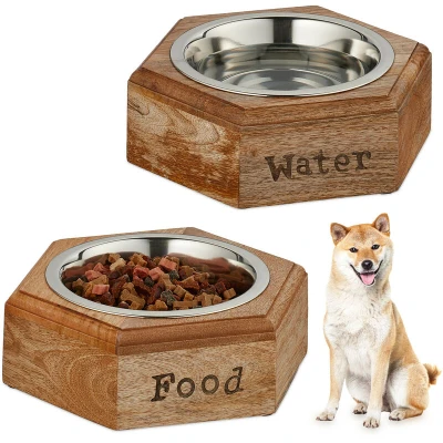 General description With these sturdy dog bowl stands, you won't have any more trouble with tipped-over bowls and scattered food on the floor. The bowls are made of stainless steel and can be easily removed for cleaning in the dishwasher. The set includes two elevated pet bowls, ideal for serving water, dry, or wet food. Technical specifications Overall dimensions (H x W x D): approx. 7.5 x 23.5 x 21 cm Dimensions of each bowl (H x D): approx. 6.5 x 16.5 cm Capacity of each bowl: approx. 1 L Weight: approx. 620 g Material: Mango wood, stainless steel Colour: Natural, silver Usage Fill the dog bowls with dry or wet food and water. Always base the amount of food on the information on the food package, not on the size of the bowl. Clean the bowls regularly, especially with wet food and high temperatures. Other information Stable and safe stand thanks to 8 non-slip feet. Bowls feature "Water" and "Food" inscriptions. Decorative items are not included.