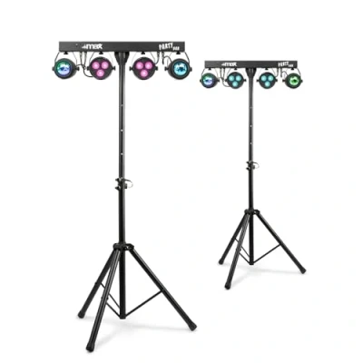 Dynamic DJ & Disco Light Bars: Includes 2x Max PartyBar1 DJ light bars, offering vibrant visual effects. Ideal for parties, events, and home discos, this disco party light kit creates an immersive atmosphere. Automatic & Sound-Activated Modes: Both DJ light bars feature automatic and sound-activated modes, adjusting to music beats or running preset patterns for a simple, plug-and-play DJ lighting system. Versatile Lighting Effects: Each bar includes 2 par lights and 2 jelly moon lights, providing smooth color washes and rotating beam effects. Perfect for a professional-grade disco party light show. Height Adjustable Tripods: Comes with adjustable tripod stands for flexible positioning, ensuring the DJ light bars deliver maximum coverage for any event or party space. DMX Compatible for Advanced Control: Easily integrate into larger DJ lighting systems with DMX compatibility. Fine-tune colors, patterns, and movements for a customized, professional lighting display.