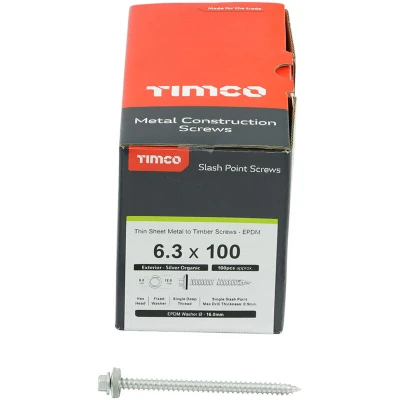 General description These TIMco 6.3 x 100mm Hex Head Slash Timber Screws are specifically designed for attaching sheet metal to timber, providing a strong and reliable connection. The screws feature a single slash point that minimizes torque and reduces the risk of timber splitting, making them ideal for use in various woodworking projects. Technical specifications Size: 6.3 x 100mm Box Quantity: 100 Head Type: Hex Maximum sheet metal thickness: 0.9mm Other information EPDM washer prevents water ingress Corrosion-resistant coating withstands over 1,000 hours of salt-spray